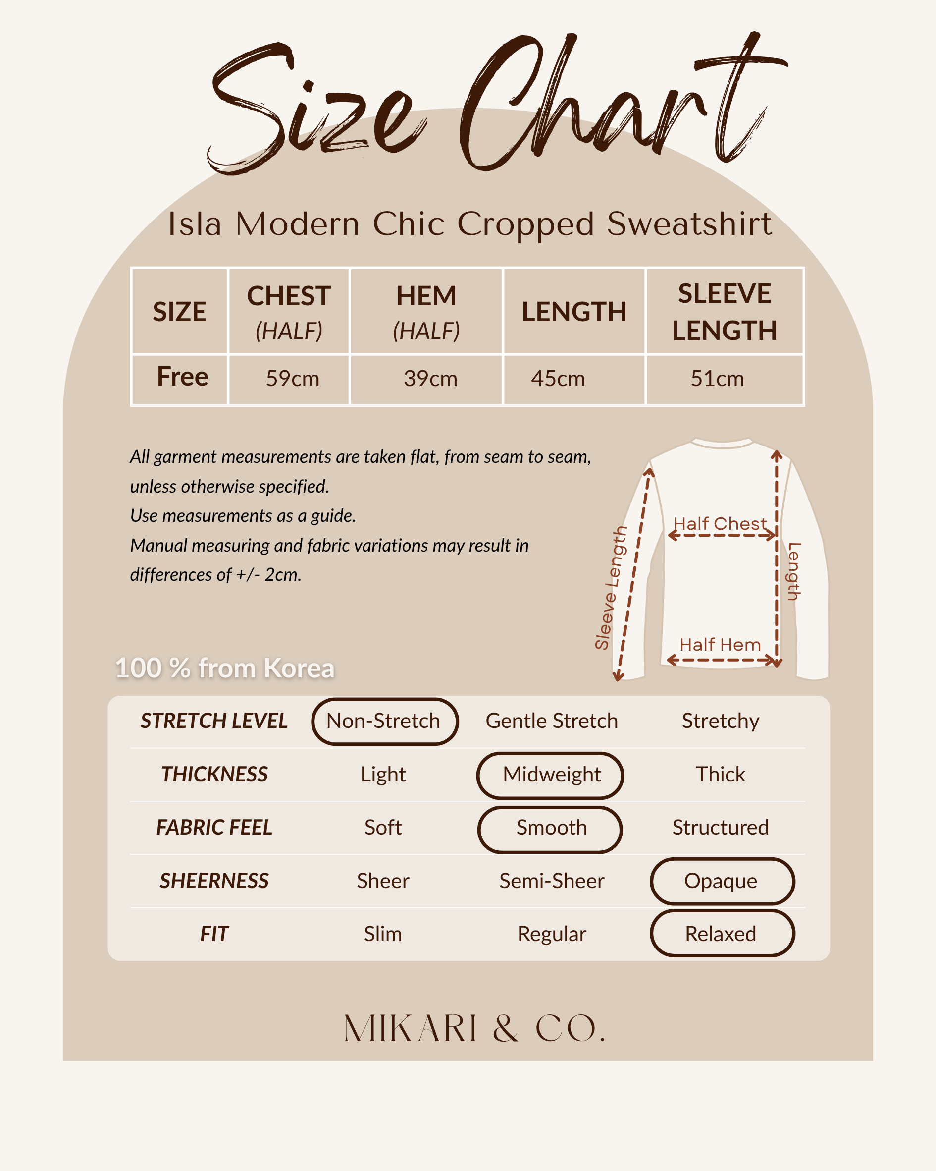 The Isla Modern Chic Cropped Sweatshirt is a contemporary essential for laid-back sophistication. Featuring a cut-and-sew design, this sweatshirt balances relaxed comfort with a stylish cropped length. The fabric blend ensures a cozy feel, making it perfect for everyday wear. Pair it with high-waisted denim or a sleek skirt for an effortlessly chic look.