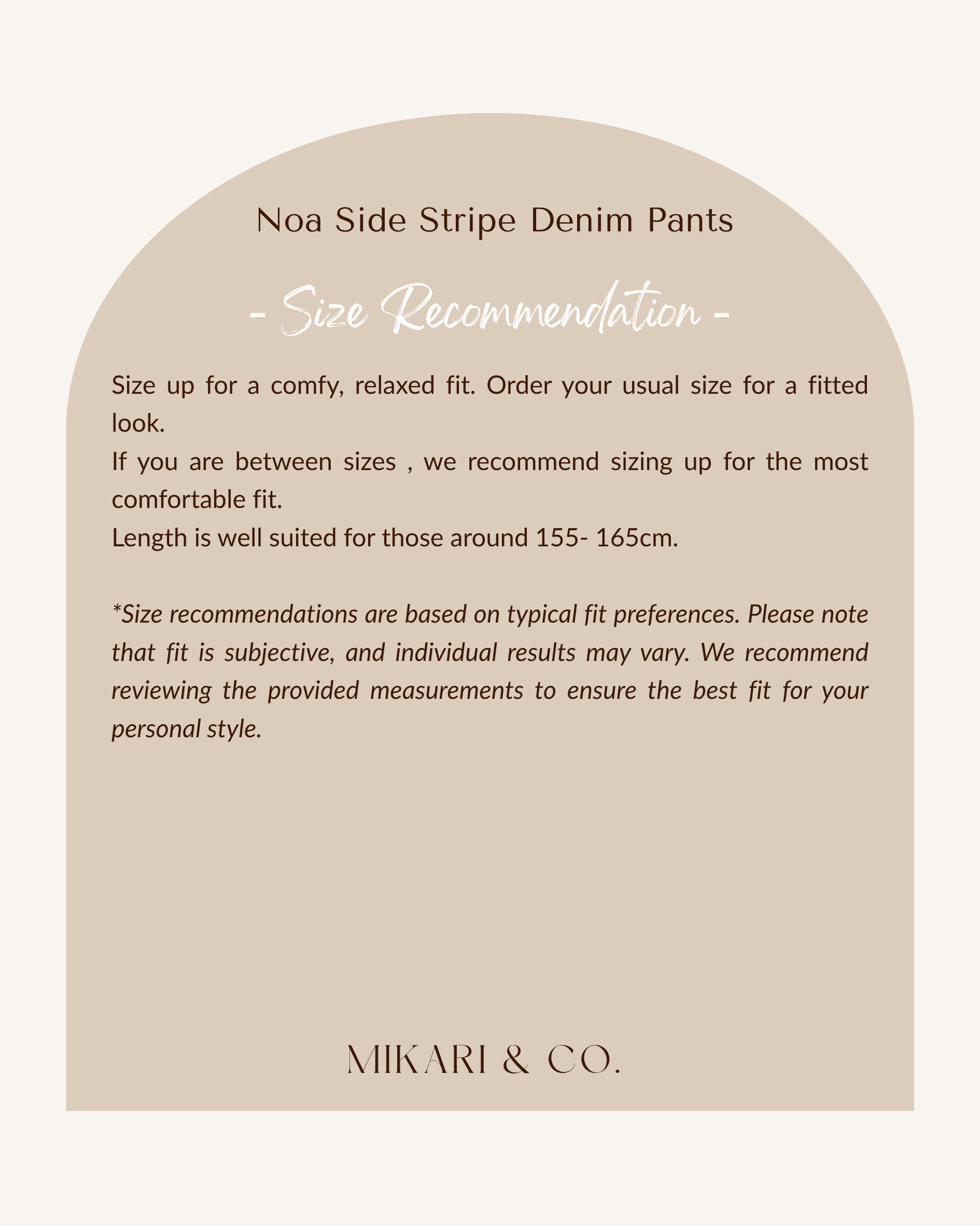 *Size recommendations are based on typical fit preferences. Please note that fit is subjective, and individual results may vary. We recommend reviewing the provided measurements to ensure the best fit for your personal style.