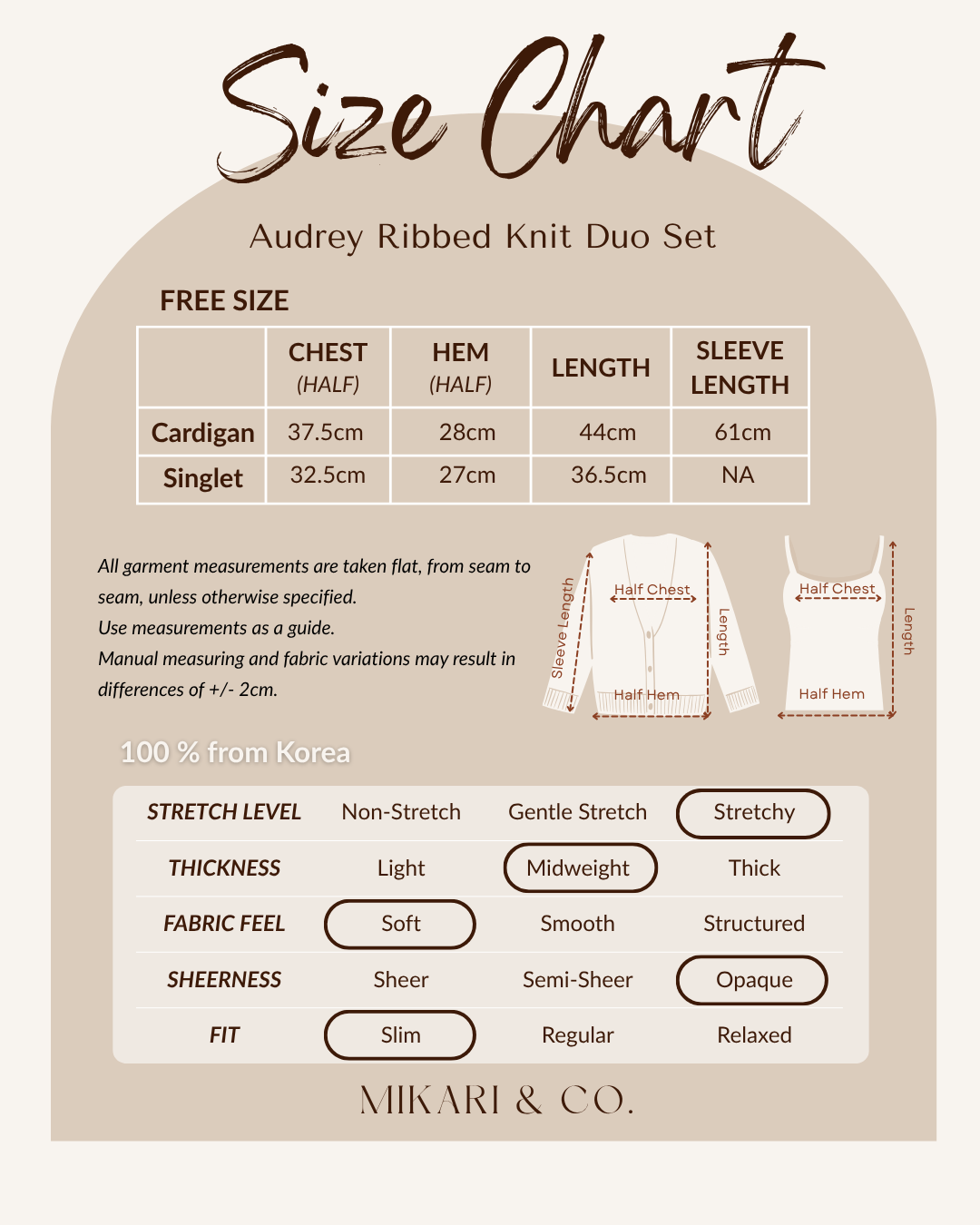 Discover refined elegance with the Audrey Ribbed Knit Duo Set, a classic pairing designed for adaptable styling. This elegant set features a beautifully structured, ribbed knit cardigan and a matching, comfortable singlet. Crafted for a flattering fit, its enduring design and premium texture offer endless styling possibilities, making it an indispensable addition to your sophisticated, everyday wardrobe.